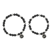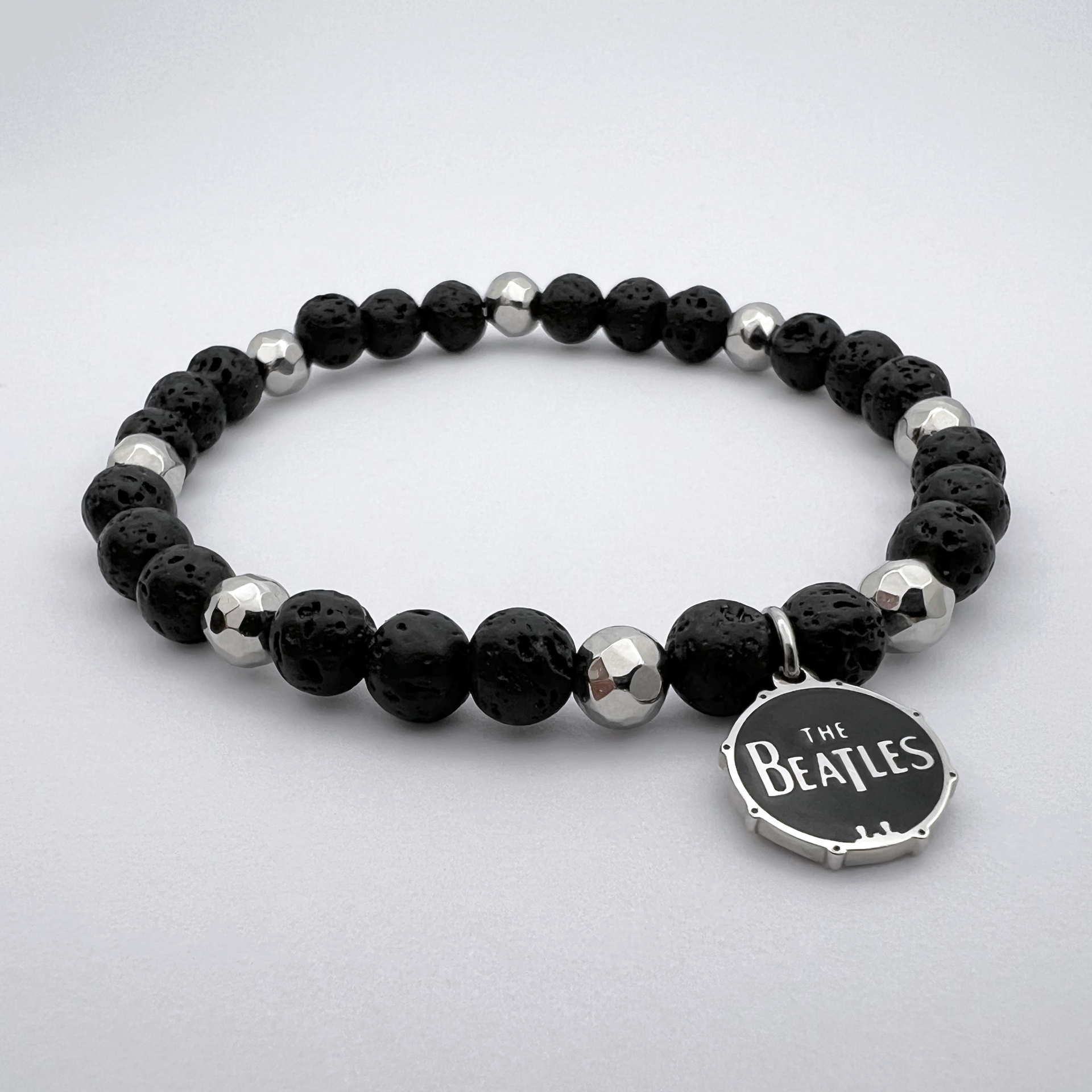 Introducing The Beatles drum logo beaded charm bracelet. Each bracelet features 6mm beads, perfectly sized for a unisex and layerable style. Accented with eight organic-shaped stainless steel beads and a custom stainless steel logo charm, this piece showcases The Beatles' iconic drum logo, blending timeless music heritage with contemporary style. The bracelet is presented in a plush black velvet pouch, underscoring the quality and attention to detail that defines this unique bracelet.