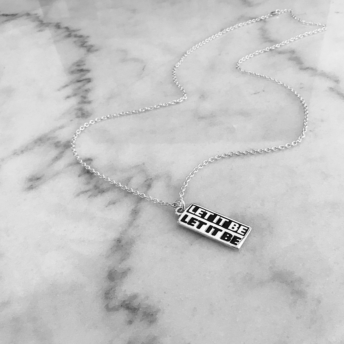 Handmade sterling silver LET IT BE ID unisex necklace with custom gift box packaging.